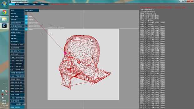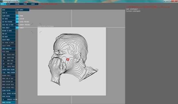 Preparé una pluma ordinaria, que llené con tinta negra. Tengo polargraph listo, coloqué el lienzo. He subido el archivo SVG para Polargraphcontroller, establecer los parámetros. Intentó la pintura sin que el lápiz. Y empecé a pintar.