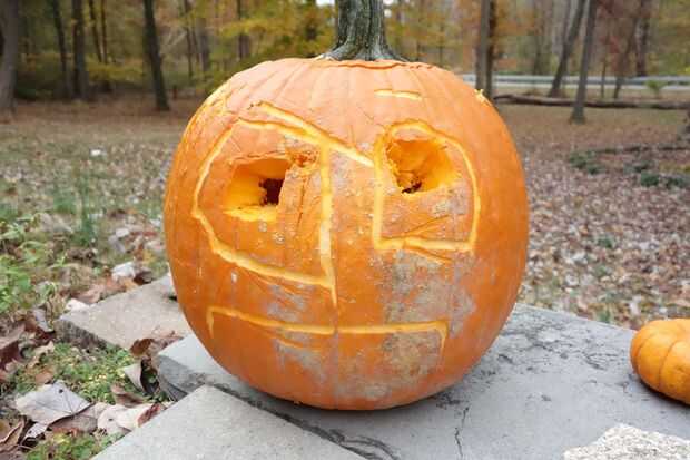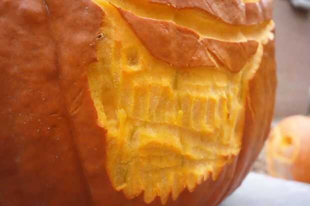 Cortar y marcar la cáscara externa de la calabaza en la cara de tu propia creación.