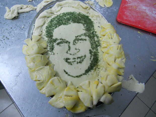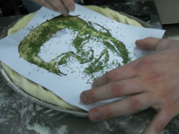 Después de cubierto el paté con la masa y envuelve los bordes he espolvoreado mantequilla derretida en la superficie, para que el ingrediente de color (en este caso seco perejil) se pegaría a la masa después de que quitaría la plantilla. Entonces he hecho algunas correcciones a la imagen añadiendo y quitando perejil aquí y allá para que se vea bonito. Último paso era añadir alguna decoración que intentaba parecerse a hojas y cubierta con yema de huevo y la empanada estaba lista para entrar en el horno.