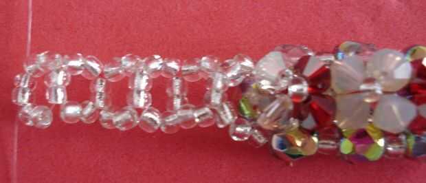 1. continuar desde donde acabaste 3 flores si tienes suficiente hilo. De lo contrario Haz una cadena de línea de nylon en 2 agujas, luego pase a través de la parte superior del grano Checo. Si 3 flores son verticales, el checo grano derecho encima de las 3 flores.