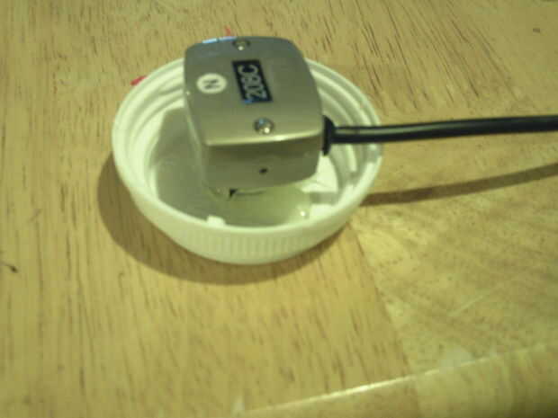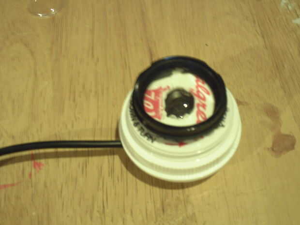 La cámara del pegamento en la tapa de la botella de píldora para que puedan ver a través. Después, pega la lente a la parte superior de la tapa de la botella de píldora.