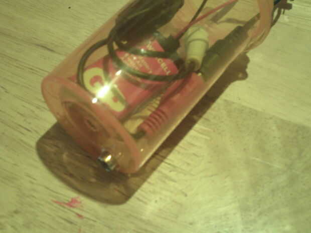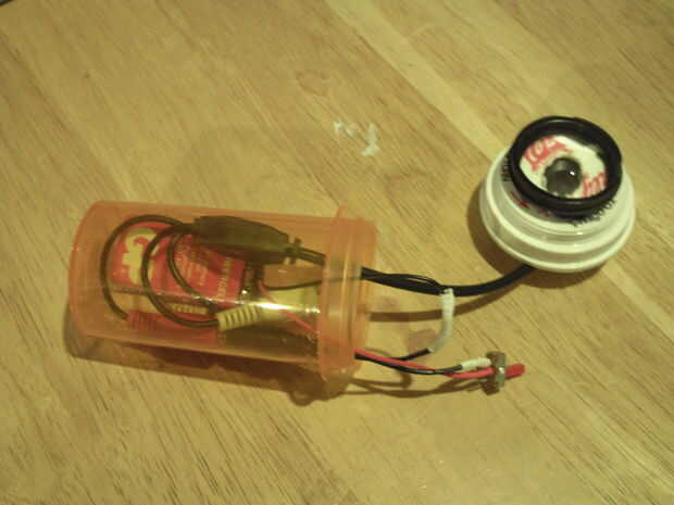 Enchufe al conector de alimentación de la cámara y comenzar a poner todo dentro de la botella de píldora. También, pegue el interruptor en su lugar en el otro agujero en la botella de píldora.