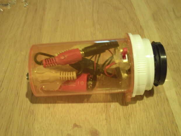 Acabado poniendo todo en la botella de píldora y el tornillo de la tapa. Lo bueno acerca del uso de una botella de píldora es es fácil de reemplazar la batería o fijar las conexiones porque la parte superior puede volver.