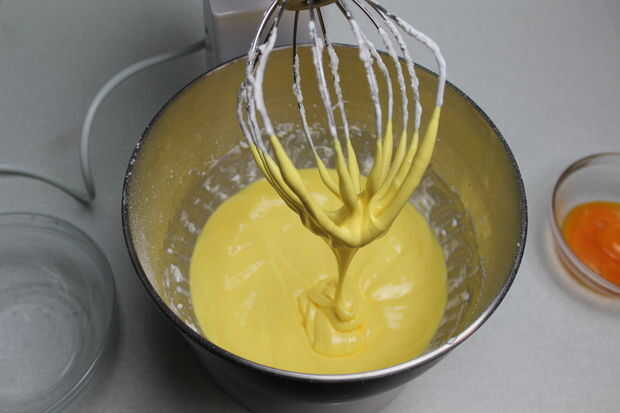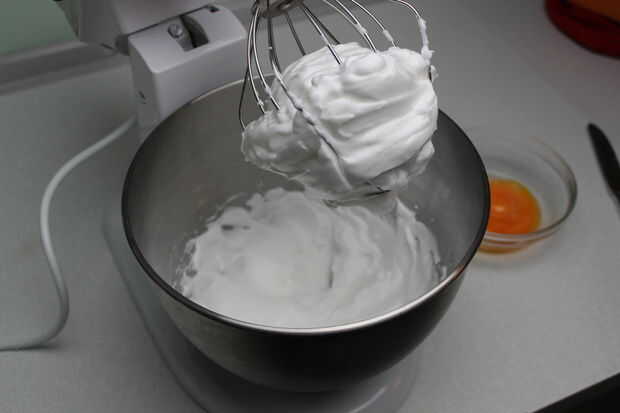 Primero separar los huevos (las yemas). Añadir una pizca de sal a las claras de huevo y los golpearon hasta que queden rígidos (como se muestra en la imagen). Luego agregar el azúcar en polvo, batir a una masa homogénea, agregar algún colorante de alimento amarillo y batir otra vez hasta que esté todo bien mezclado. Ahora dejar cerca de un tercio de la masa, necesita para el glaseado más adelante encendido.