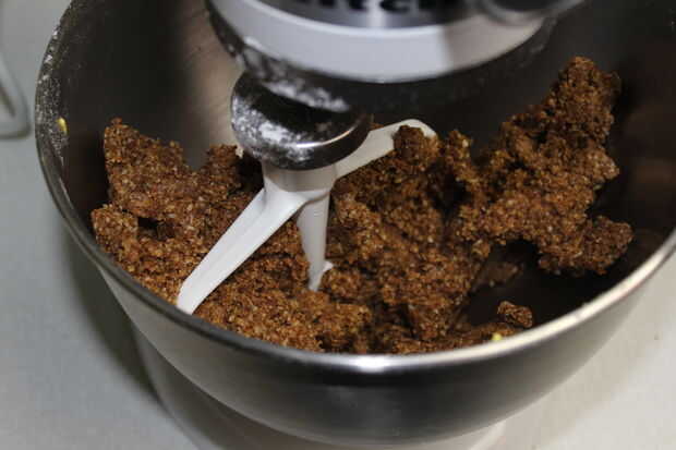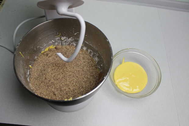 Cambiar el batidor de huevo con el gancho para masa y añadir las almendras y la canela a los 2/3 de su color de huevo. Batir otra vez hasta que se mezcla correctamente masa (como se muestra en las fotos).