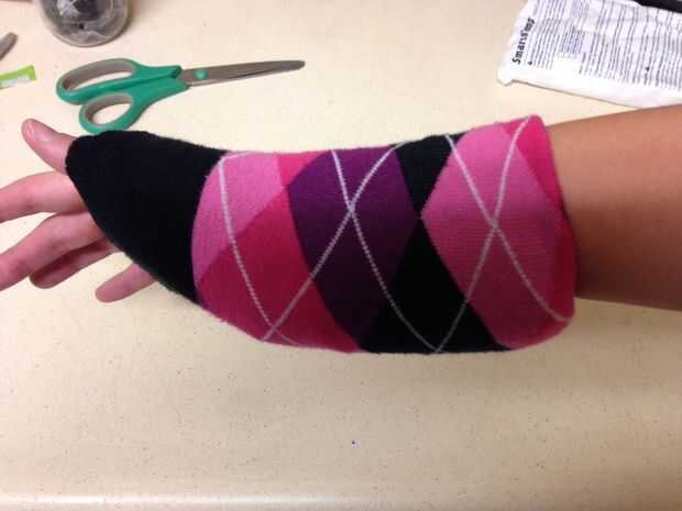 Mi calcetín era super largo tenía pleny de legnth extra pero realmente sólo necesitas un par de pulgadas a doblar para que eres paquete permanece en el lugar. Quizás tenga que probar estos pasos un par de veces para conseguir el ajuste a lo que te gusta pero es una manera simple para mantener el hielo en lugar con hacia fuera tener que comprar algún lujo absurdo de correa de velcro.