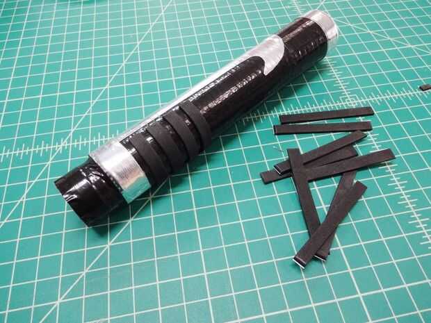 Las empuñaduras eran decoradas simplemente cubriéndolos con cinta adhesiva. Algunos tenían acumuladas capas de cinta adhesiva para crear crestas y anillos, y todos tenían características como botones y agarre cojines hechos de espuma de artesanía de sticky back.