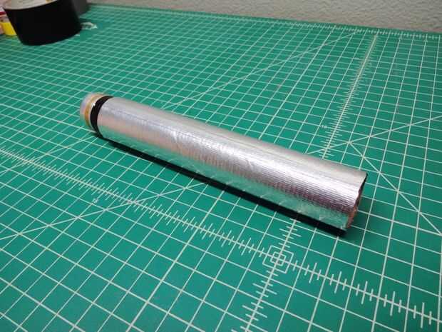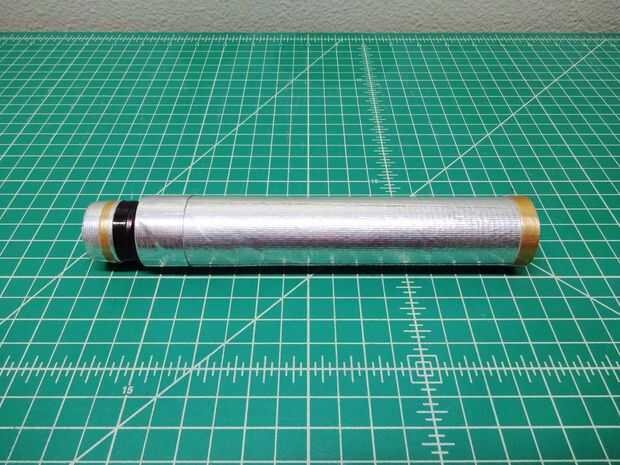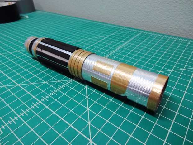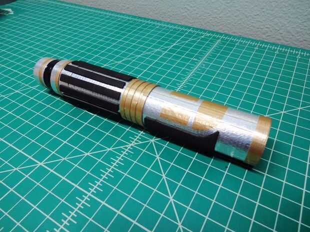Esto fue hecha por envolver una capa base de cinta de cromo y luego agregando detalles hechas de espuma negra y cinta de oro.