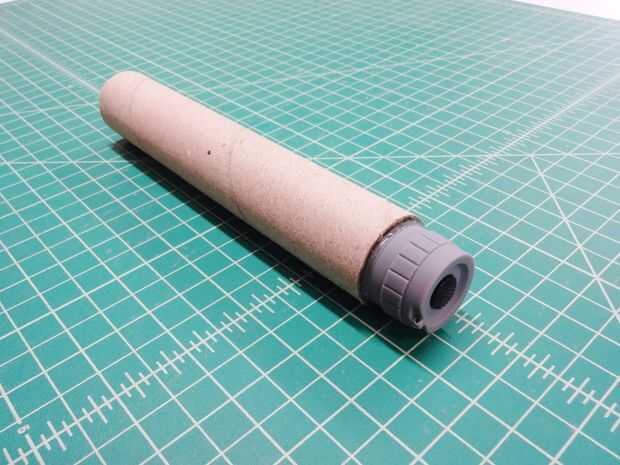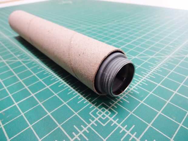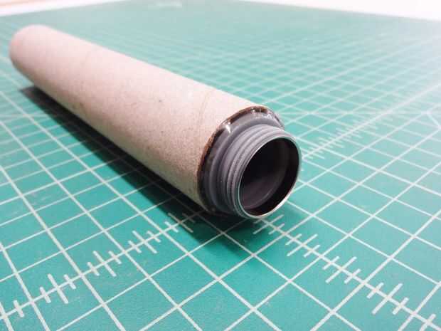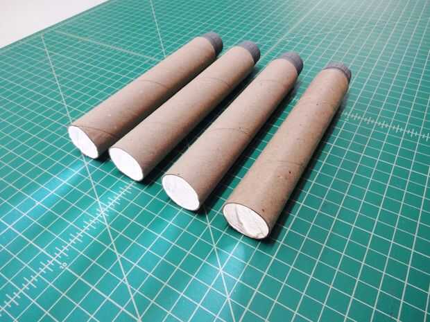 Para comenzar a crear cada empuñadura de sable de luz, una linterna se instala en los extremos de los tubos de cartón. La batería extraíble tapas quedan expuestas, por lo que las baterías pueden ser reemplazadas cuando sea necesario.