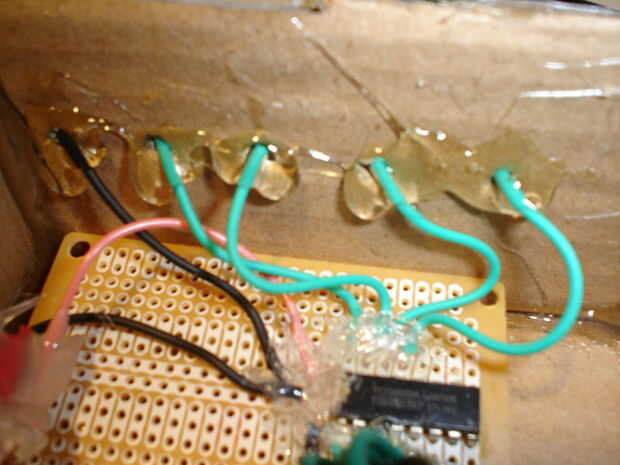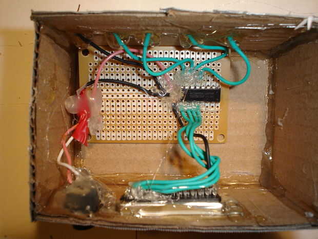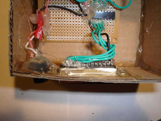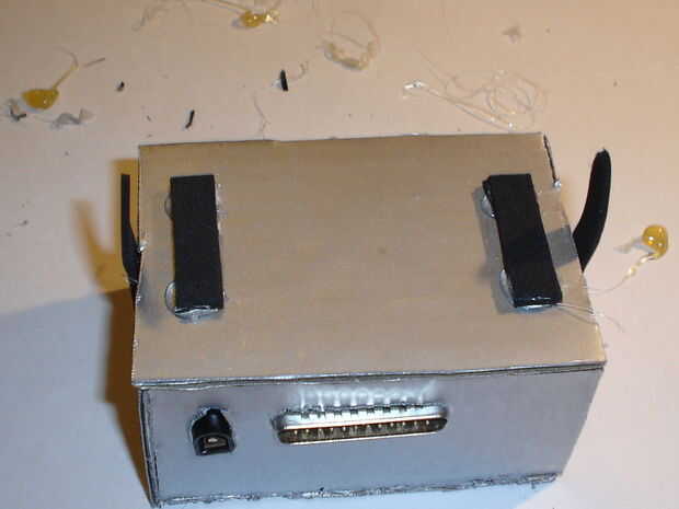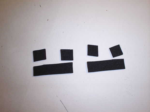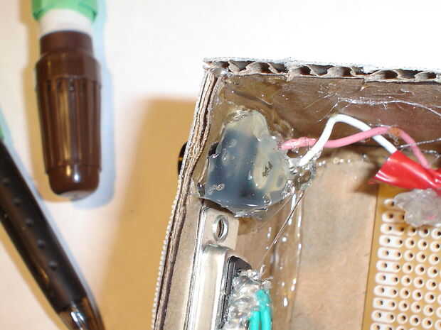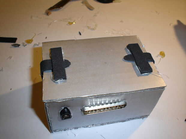 Ahora debe pegar componants dentro del recinto. Asegúrese de poner un montón de pegamento en los tapones como se expondrá a un montón de fuerza. Para mantener la caja cerrada, necesitará realizar algunos cierres. Necesita cortar dos fichas fuera de espuma de artesanía. A continuación, cortar dos tiras de espuma y de cuatro pequeños cuadrados. Pegar dos de los cuadrados para cada tira como se muestra en las fotos. Pegar una pestaña a cada lado de la caja. Pegar las tiras en la parte superior de la caja. Esto concluye la construcción de la caja.