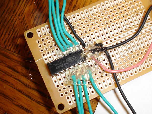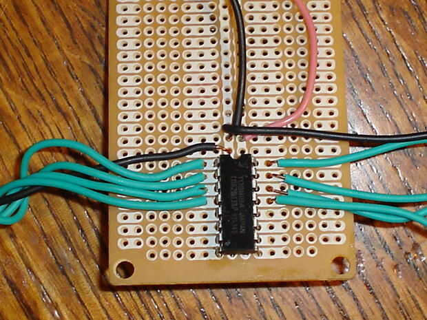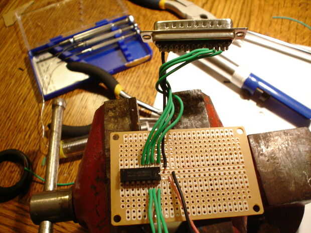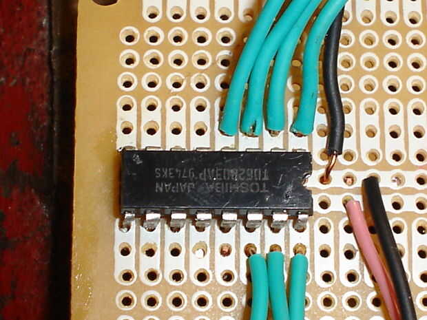 Cada pin a la Junta de la soldadura. Mi consejo había dos carriles de la energía corriendo hasta el centro del tablero, por lo que soldar el pin positivo en el uln2003 (ver esquema de aquí y en la foto) a la de los rieles y el pin negativo al otro carril. Luego, debes soldarlo pin 2 en el conector de puerto paralelo al pin 1 en el uln2003. Soldar el pin 3 en el puerto paralelo al pin 2 en el uln2003, pin 4 en el puerto paralelo a la clavija 3 en el uln2003 y pin 5 del puerto paralelo al pin 4 en el uln2003. Ahora soldar el pin 25 del puerto paralelo al riel negativo en su placa de circuito. Ahora, suelde el motor al conductor. Conectar el motor a la Junta requiere algún ensayo y error. Yo sólo había soldado los cables que podía usar clipes. También puede usar terminales de tornillo o algo similar. Simplemente soldar un cable con conector de 16, 15, 14 y 13 en el uln2003. Luego suelde un cable (preferiblemente negro) para el carril positivo. El controlador está casi listo. Por último, soldar a su toma de barril (mina había reciclada de un viejo coche RC) para los carriles de la energía en su circuito. Para evitar que los cables de mi interrupción, puse pegamento caliente sobre ellos.