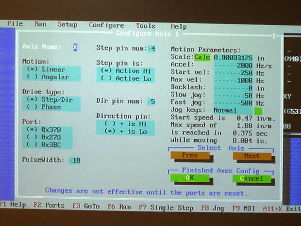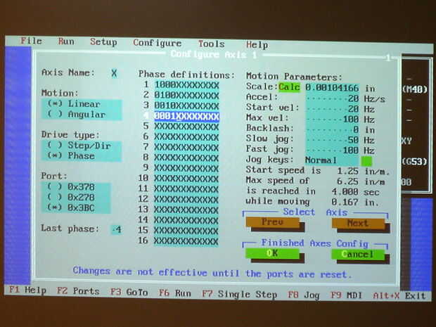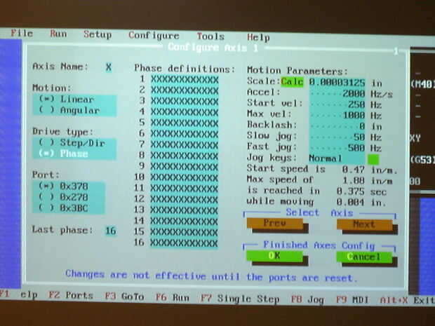 Para utilizar la calculadora, debe encontrar el número de pasos por revolución que lleva tu motor. Google su motor número de parte y busca cuántos grados por paso se toma. A continuación, dividir 360 por el número de grados por paso para encontrar tus pasos por la revolución. Por ejemplo, mi motor gira 7,5 grados por turno, por lo que dividir 360 por 7.5 para obtener 48. Perforar ese número en la calculadora de la escala. Dejar el resto de la configuración de la misma. Presione ok y luego copiar el número en la casilla de escala a la caja de escala en el otro equipo. A continuación, cambie el valor en el cuadro de aceleración 20, como el valor predeterminado 2000 es demasiado rápido para su sistema. Cambie el valor de la caja de velocidad de salida a 20 y el valor de la caja de velocidad max 175. Cambie el valor del ayuno jog caja a 175. Presione tab hasta llegar a la opción "Última fase". Cambiar su valor a 4. Presione la tecla tab hasta llegar a la primera fila de x Copia lo siguiente en los primeros cuatro cuadros: