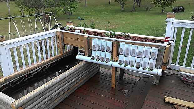 Sin más demora, les presento a nuestro sistema de acuaponia (aproximadamente) a 200 galones, construido de madera re-purposed, un kit de estanque barato, algunos PVC y lava rocas.
