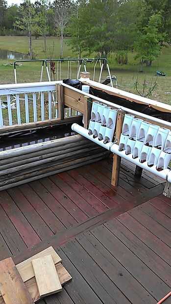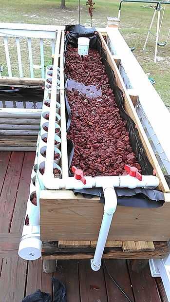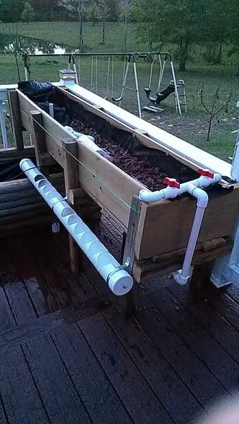 Ahora, lo que no se puede ver en estas fotos es que hay un tubo de PVC de 1" funcionamiento de mi bomba hacia el lado opuesto de la cama de crecimiento. Se esconde debajo de la cama. Usé un separador en T para crear dos corrientes de agua. Uno va a la cama y el otro es ir largo wyas doen las fresales Torres y se establecerá en un hilo.