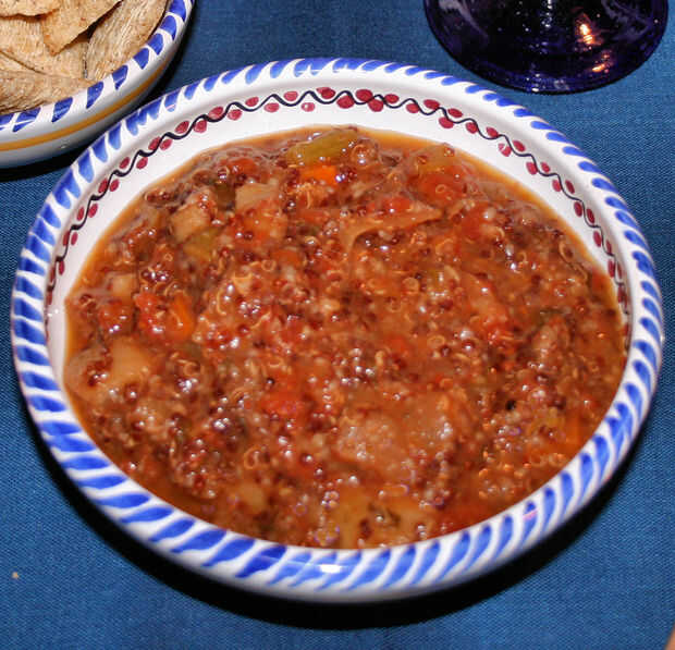 La mañana siguiente, poner en la taza de quinoa y mantenga el bote en alta durante al menos una media hora. Usted puede dar vuelta hasta baja cuando la quinua esté cocinada, sólo tarda unos veinte minutos más o menos (me gusta darle es una hora en la olla inferior temperaturas de pote). Realmente va espesar la sopa. Quinua roja Inca sólo desaparece en un plato base de tomate pero agrega un sabor encantador sin el colesterol en carne. Está listo para comer en cualquier momento después de eso. Todavía estoy terminando este lote dos días más tarde, todavía deliciosas y todavía no estropeados porque no hay ninguna grasa a rancio. Si te aburres de comer durante días, alimentar bien tus amigos hambrientos o congelarlo en porciones individuales.