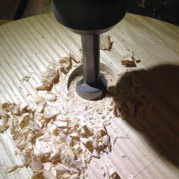 2) ahora le taladre el segundo agujero del diámetro de la espiga que se convirtió en el torno. En este caso voy a perforar tan profundamente como sea posible sin cortar hasta el otro lado, dejando aproximadamente 1/8" en el tacto.