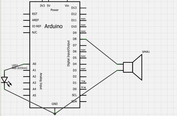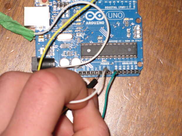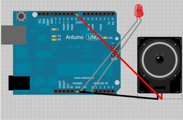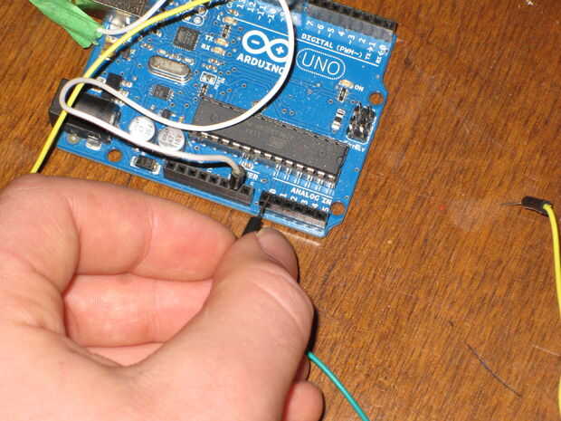 Conecte el extremo positivo de la L.E.D analógico 0 en arduino (A0), casi desafiante necesita soldar los cables al led para conseguir que encaje en el arduino. Conecte el extremo negativo del led a gnd de arduino.