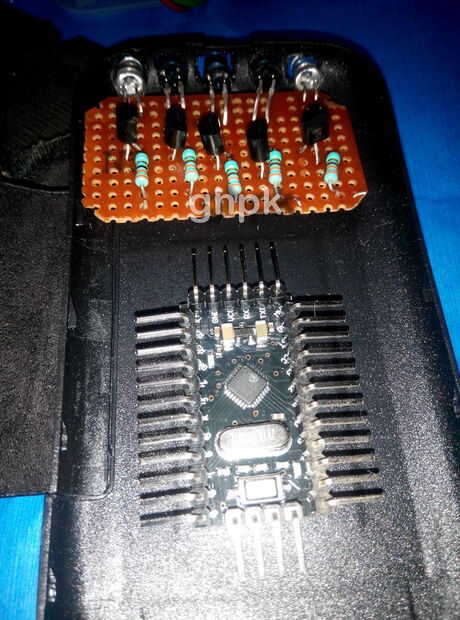 Conectar Arduino Mini Pro al PC y subir el TV-B-Gone bosquejo disponible aquí Ken Shirriff ya ha hecho modificaciones a anteriores versiones e incluye dos más puntos