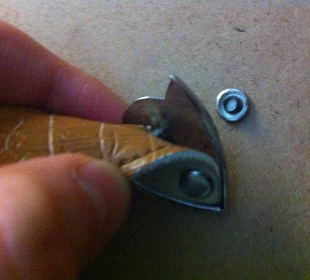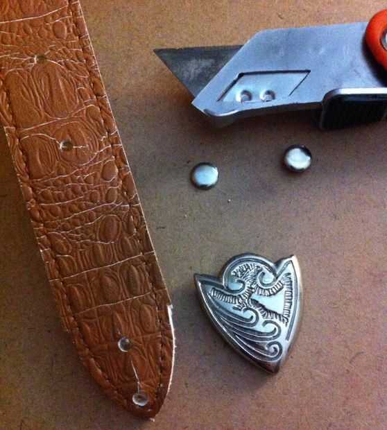 En primer lugar tomar el cinturón, y dependiendo de sus preferencias, necesitará quitar la lengüeta del metal en un extremo de la correa, esto se convertirá en el "nudo". Ya que no estaba planeando sobre el uso de la correa de cuero luego elegí hacer un corte a través de la correa para tirar del hardware de la correa como un botón encima de la camisa. Después de eso solía pinzas pop la redonda cabeza del remache.
