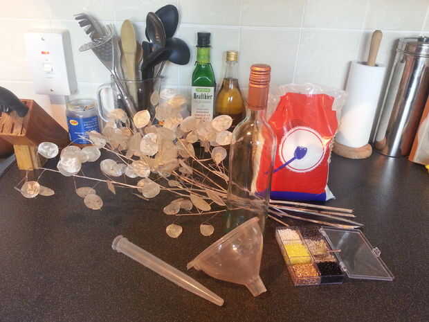 Después de haber visto una bolsa de sal que ha sido en la parte trasera de un armario para burro pensé que trabajaría para mantener los tallos en su lugar y proporcionar estabilidad. Ser una Urraca por naturaleza también quería un poco de detalle brillante y profundizó en mis cajas de bolas, colocar en algunos poco perla y plata forrado granos de la semilla clara.