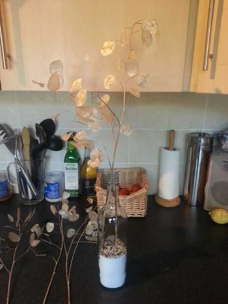 Añadir sus otras sucursales trabajando de más larga a más corta, cruzando los tallos para que se sienta muy bien hacia fuera. Si tienes una botella de vino como el mío encontrará que permanecerán muy verticales desde el cuello es estrecho.