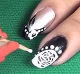 6. dentro de la forma blanca, dibujar curvas en forma de C para que la forma de una flor. Realizar puntos blancos justo debajo de la base de la forma ovalada.  Hacer similares diseños en uñas alternas.
