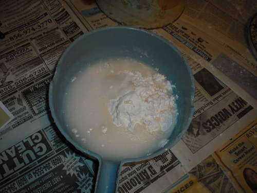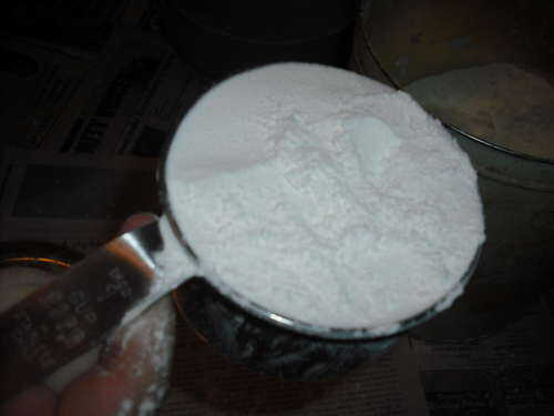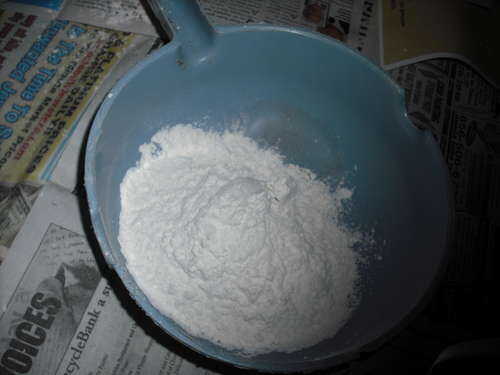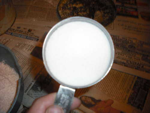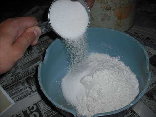 Medir hacia fuera 1 taza de cuatro y viértala en la Cuba. Luego, mida 1/2 taza de sal y añadir que a la taza. por último, llene la taza de medición con 1/2 taza de agua y viértala en el Bol.