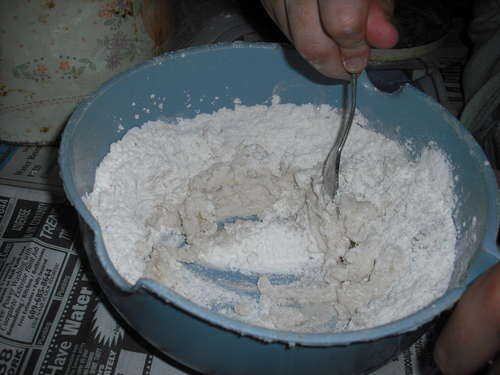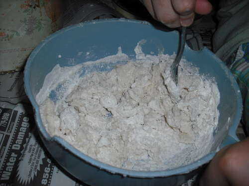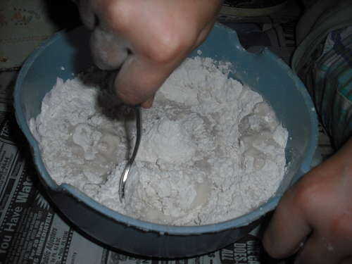 tomar una cuchara - hará cualquier cuchara; y utilice para mezclar los ingredientes. Mezclar hasta que esté blanda y no es ni Aguado ni harina - y.
