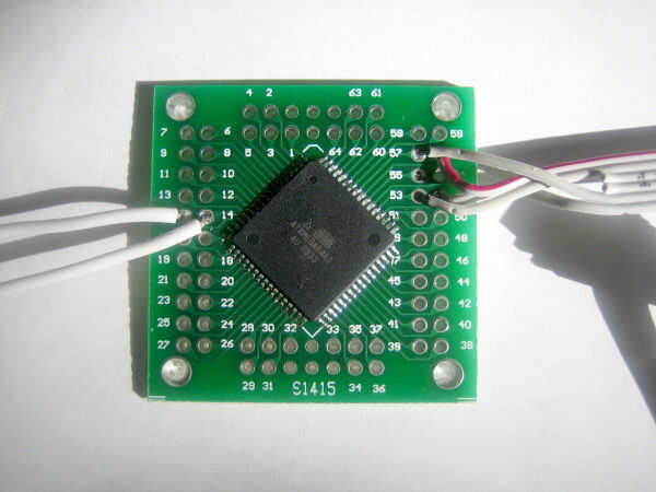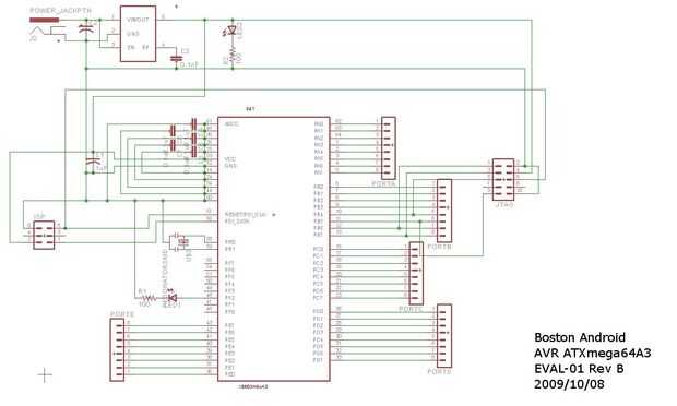 Las instrucciones aquí son simplemente comprar el tablero de dev de Xmega Boston Android EVAL-01 . Pero también puede crear su propio por comprar una placa de adaptador TQFP 64 (comprobar ebay ~ $5) y comprar un chip Xmega64a3 de Digikey o Mouser (~ $8). A continuación es el esquema para la Junta de EVAL-01.