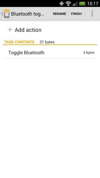 La etiqueta: Se trata de una etiqueta de tarea sencilla que utiliza Activar Bluetooth. Cambiar interruptores de off a on o a off, dependiendo del estado actual del teléfono.