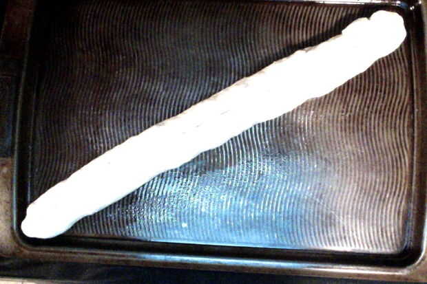 Si usted nota que la masa se ha expandido hacia el exterior, pero no hacia arriba, entonces significa que no pones en suficiente harina. Si estás dispuesto a esperar más tiempo puede amasar harina más y dejarlo subir de nuevo. Por otra parte sólo puede aceptar el hecho de que esta baguette será más plana que la mayoría y cambie la siguiente