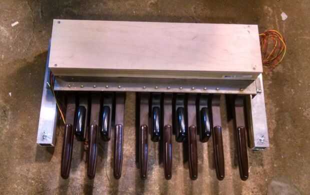 Lo primero que necesitábamos eran algunos pedales. Una breve búsqueda de Ebay rindió algunos pedales de un antiguo órgano de hammond, el tipo que su abuela tenía en su sala de estar, que tenía 13 pedales interruptores normalmente abiertos y una serie de robustos y fáciles de soldadura para tiras de cobre. Porque los pedales fueron diseñados para ser atornillados en la parte inferior de un órgano, un poco de trabajo cubierta tenía que hacer. Alguna acción de aluminio fue agregado para bajar los pedales el piso y hacerlos jugables. A continuación, una caja para mantenerla cuidada y contenida. Lo que terminé con parecía esto.