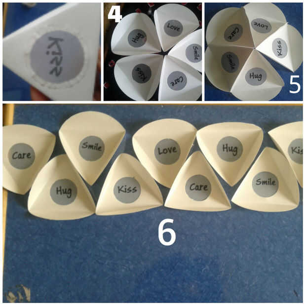 - Se pegan 5 círculos para que cuando usted lea directamente la esquina del triángulo debe apuntar al suelo. Los utilizamos para hacer la parte inferior de la lámpara. Ver imagen 4