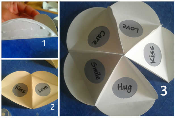 2. Aplicar pegamento en el lado de un círculo (ver imagen 1) y pegarlo al lado opuesto de otro círculo (ver imagen 2). Unir los 5 pero no pegar el primero y el último, por lo que se ve como se muestra en la imagen 3. Esto es necesario para que podamos introducir la luz dentro de la lámpara. Observa cómo se acerca la forma