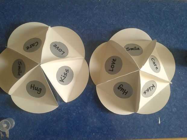 2 Aplicar pegamento en el lado de un círculo y pegarla al lado opuesto de otro círculo. Unir todos los 5 y también pegar el primero y el último, por lo que se ve como se muestra en la imagen 3. . Observe cómo la forma se acerca y también cómo las palabras son legibles sin invertir la cabeza :-)