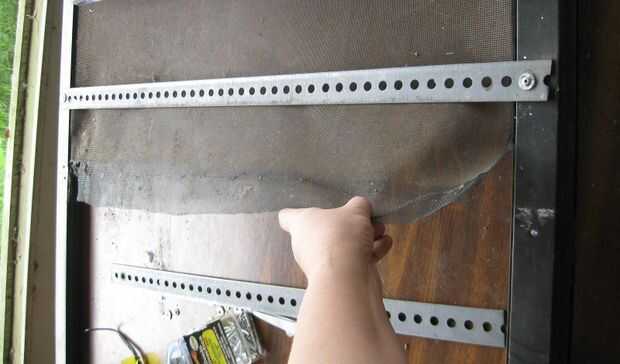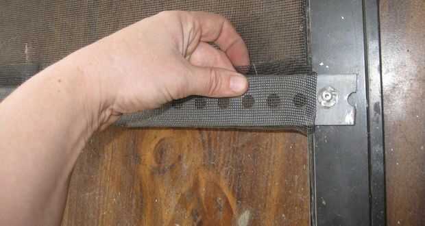 Doblar el borde inferior de la pantalla alrededor de la barra, tratando de asegurarse de que la parte arriba de la barra está tenso. Puede utilizar abrazaderas de resorte u otros medios para mantener la pantalla hasta que cosas Haz Unidas.