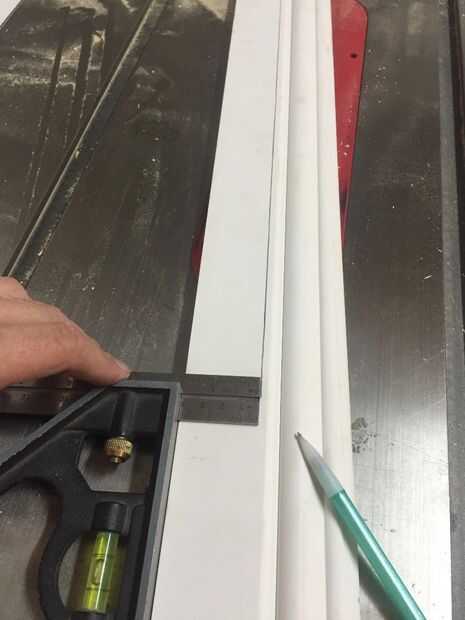 Había medido la longitud de la placa base después de instalar los retornos y era 3 pies (36 pulgadas). Así que corté los ingletes en el moldura adecuada. Una vez cortadas, trace una línea en la placa base como una guía para ayudar a cola y clavo la moldura a la placa base. Decidí usar un 1/8" revelan, pero usted puede optar por hacer lo que le plazca.