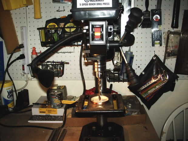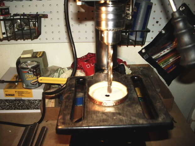 Paso 2 es perforar un agujero en el centro de la tapa del tarro de masón. Para ello utilizo mi taladro de banco para asegurar un agujero perfectamente centrado sin bordes irregulares, y me permite sostener la tapa estable durante la perforación. He encontrado que 5/16" bits es perfecto para este proyecto.
