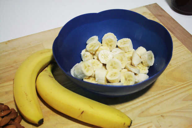 Lo primero que tienes que hacer es cortar los plátanos en trocitos y ponerlo todo en un bol.