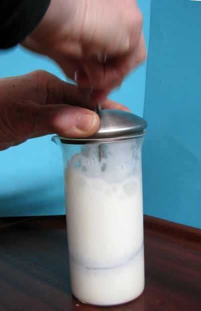 Retire el émbolo jarra del microondas y vuelva a colocar el émbolo en la jarra. Agitación vigorosamente de 10 a 20 veces para espumar la leche.