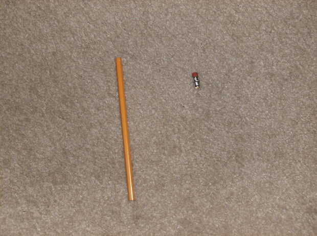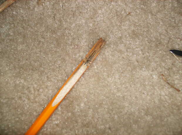Bien, tomar el lápiz y con unos alicates, o si quieres, tus dientes y sacar la goma de borrar. Asegúrese de que obtener la cosa de metal también. Una vez apagado, desechar la pieza metálica y el borrador. Ahora, toma el cuchillo pequeño y dividir el pencil(see photo). Ahora toma el cuchillo y cortar a nick cerca de la mitad una pulgada del extremo en la parte de split en la pencil(photo). Tenga cuidado, ya que puede romperse fácilmente.