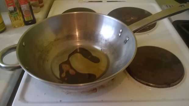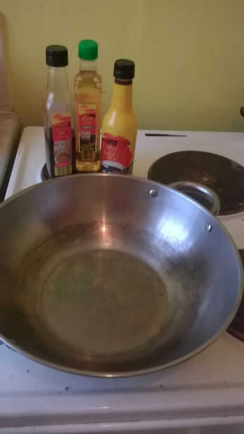 Esta es una selección barata pero deliciosa de supermercado trabajo aceite, aceite de sésamo y salsa de soja. Supermercados chinos también son una buena fuente de estos artículos. He combinado estos ingredientes juntos y tiene agradable y caliente antes de comenzar a freír los ingredientes.