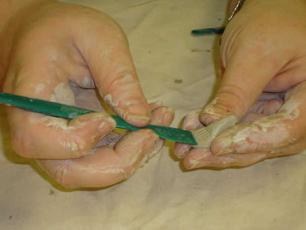 Usando cualquier trocito de arcilla de desecho que se puede liar una bobina con un punto y un borde plano