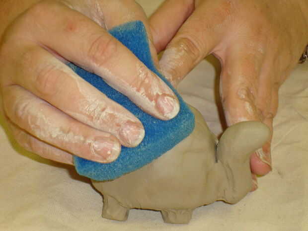 Usted puede en este get punto algunos "elefante" de la piel. Si se está agrietando la arcilla toma una esponja y lo húmedo. Luego escúrralo hasta que casi toda el agua fuera de ella y frotarla sobre la arcilla. Repita si es necesario. Otra vez, un poco de agua va un largo camino, mucha agua y tienes un lío de barro que cae una parte y todo su trabajo se arruinará. Recuerde que es fácil de añadir más, no es fácil quitársela.