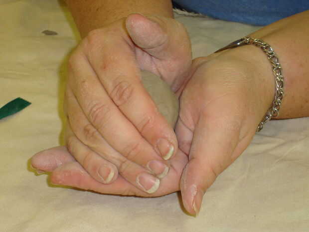 Si la arcilla se está agrietando y dependiendo de su cuerpo de arcilla en esta etapa es posible que esto ocurra. Tome los dedos y ponerlos en el recipiente de agua y frótese las manos entonces pat más. No quieres saturar más la arcilla, un poco de agua va una manera larga. Sólo sumergir tus dedos y acariciando el agua en la arcilla ayudará a introducir agua en el cuerpo de la arcilla con haciendo un lío baboso.