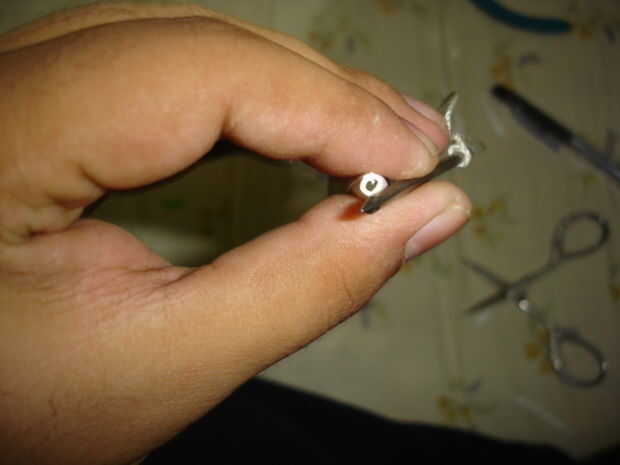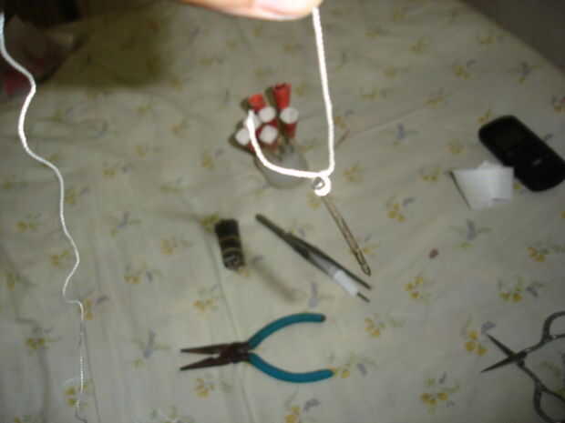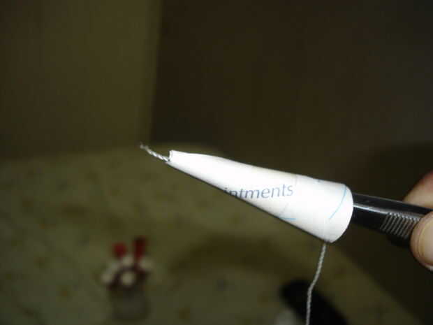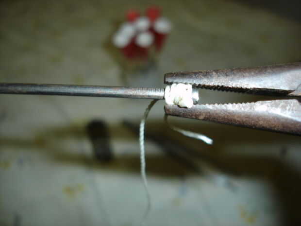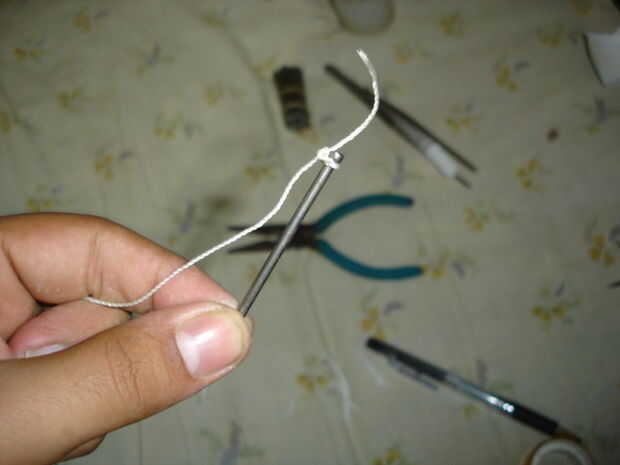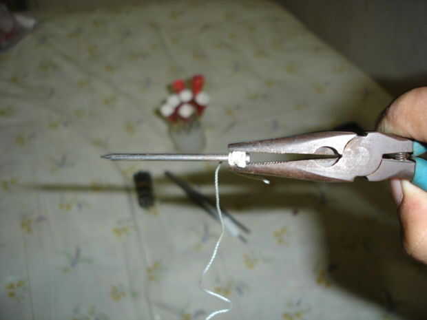 6 > anteponer el segundo final de la rosca en el cono, a continuación, envuelva el hilo alrededor de la cabeza del clavo.