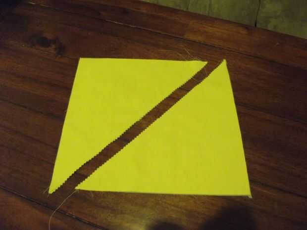 Una vez que han cosido por ambos lados de la línea, utilice la línea dibujada como guía de corte y dividir los bloques cosidos a la mitad! Presione con la plancha para abrir las 2 plazas que ha creado.