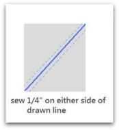 Ahora necesita coser una costura de 1/4" a cada lado de la línea que habíamos dibujado por la mitad de nuestras plazas fijados.