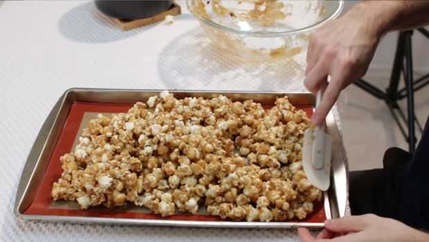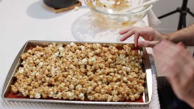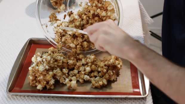 Ahora tomamos nuestro palomitas de caramelo pegajoso y colóquelo en la bandeja para hornear, forrado con una Alfombra artesanal, o pergamino, papel o engrasado. Luego extiende las palomitas hasta que es agradable y plana. Si usted está haciendo más entonces, utilizar dos hojas, no tratar y poner todo en una sola hoja. Ahora seguir adelante y poner esto en el horno precalentado y hornear durante 15 minutos.