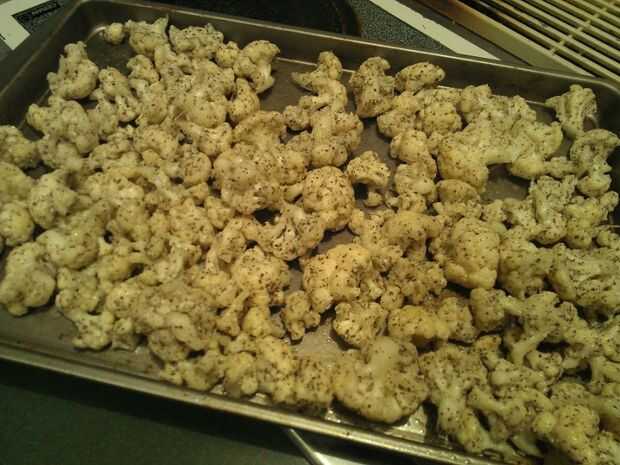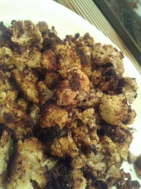 El próximo día *, organizar las brocas vegetales asombroso marinadas en una placa para horno, en una sola capa (tendrás suficiente para los dos lotes, si utilizas dos cabezas como lo hice). Hornear en un horno caliente a 425° por aproximadamente una hora. Sacúdalo un par de veces con una espátula como se va, para que usted obtenga cosas incluso. Quieres hacerlo comienza a marrón oscuro, casi quemado mirando, pero no demasiado charcoaley, porque es bruto. Una vez convierte marrón oscuro y un poco crujiente en el exterior, la dulzura natural de la coliflor se convierte en mayor.